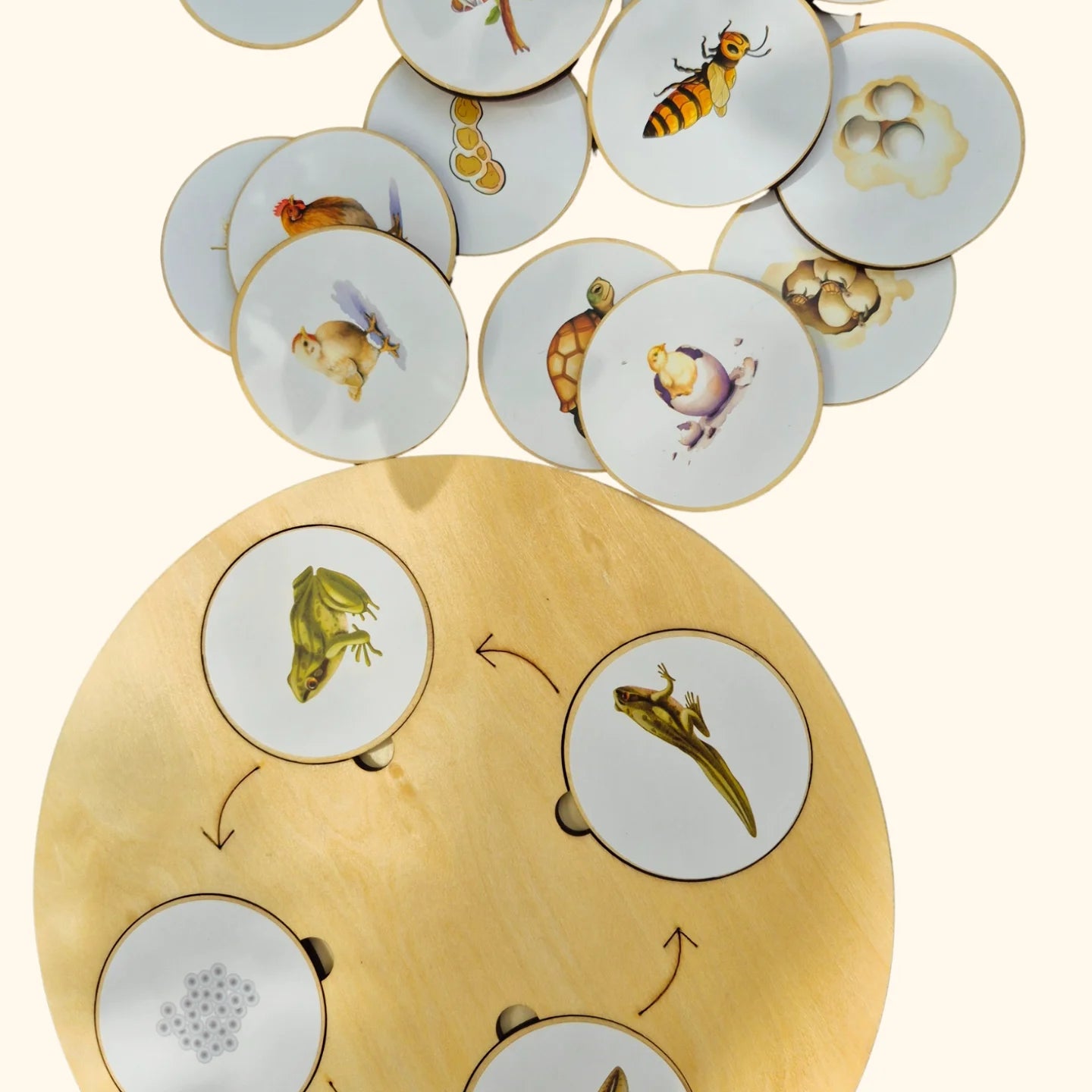 •Wooden life-cycle discs & activity board to explore how creatures grow